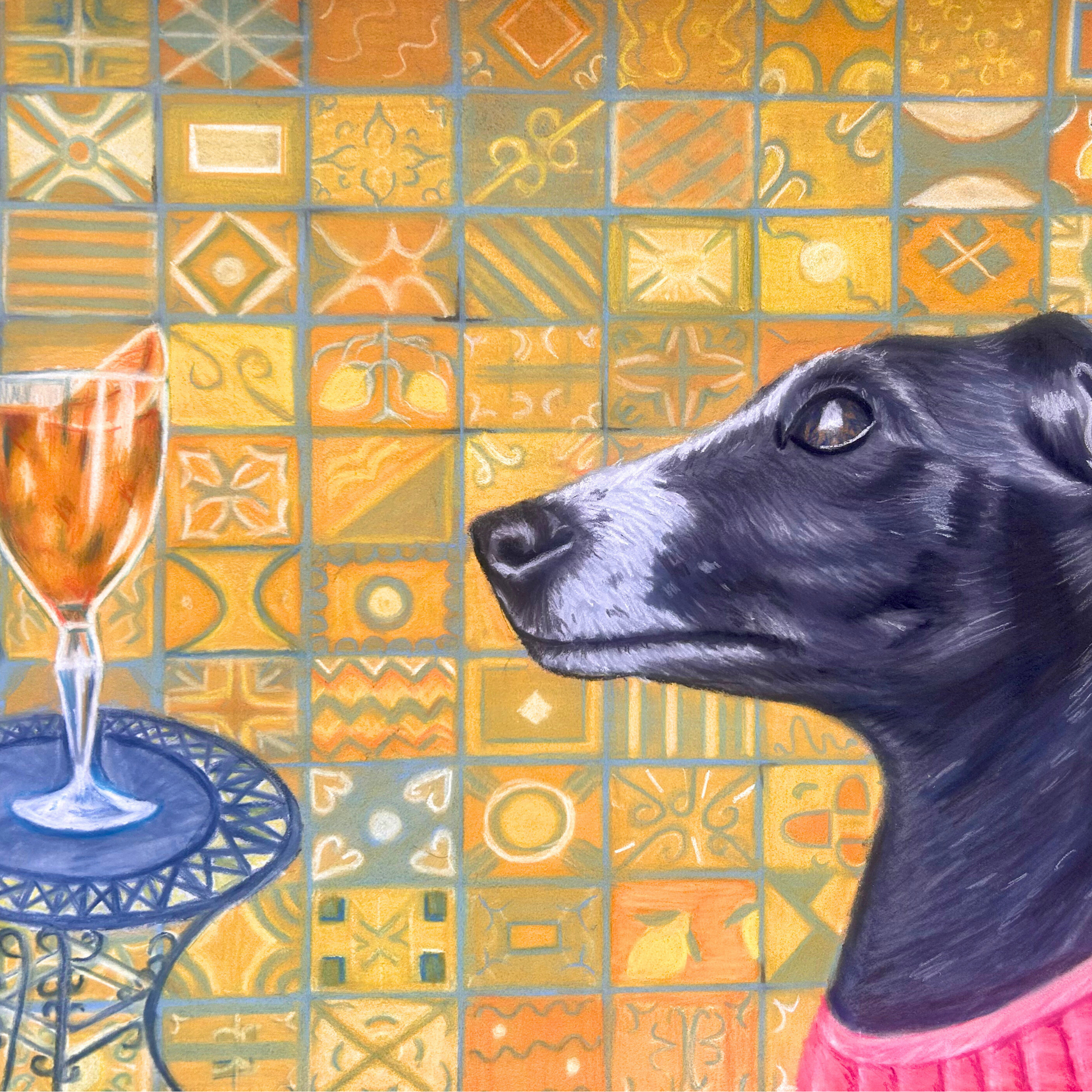 A Taste of Amalfi captures the elegance of Italian living with a graceful sighthound enjoying an Aperol Spritz against the sun-soaked charm of the Amalfi coast, drawn in delicate pastel pencil.