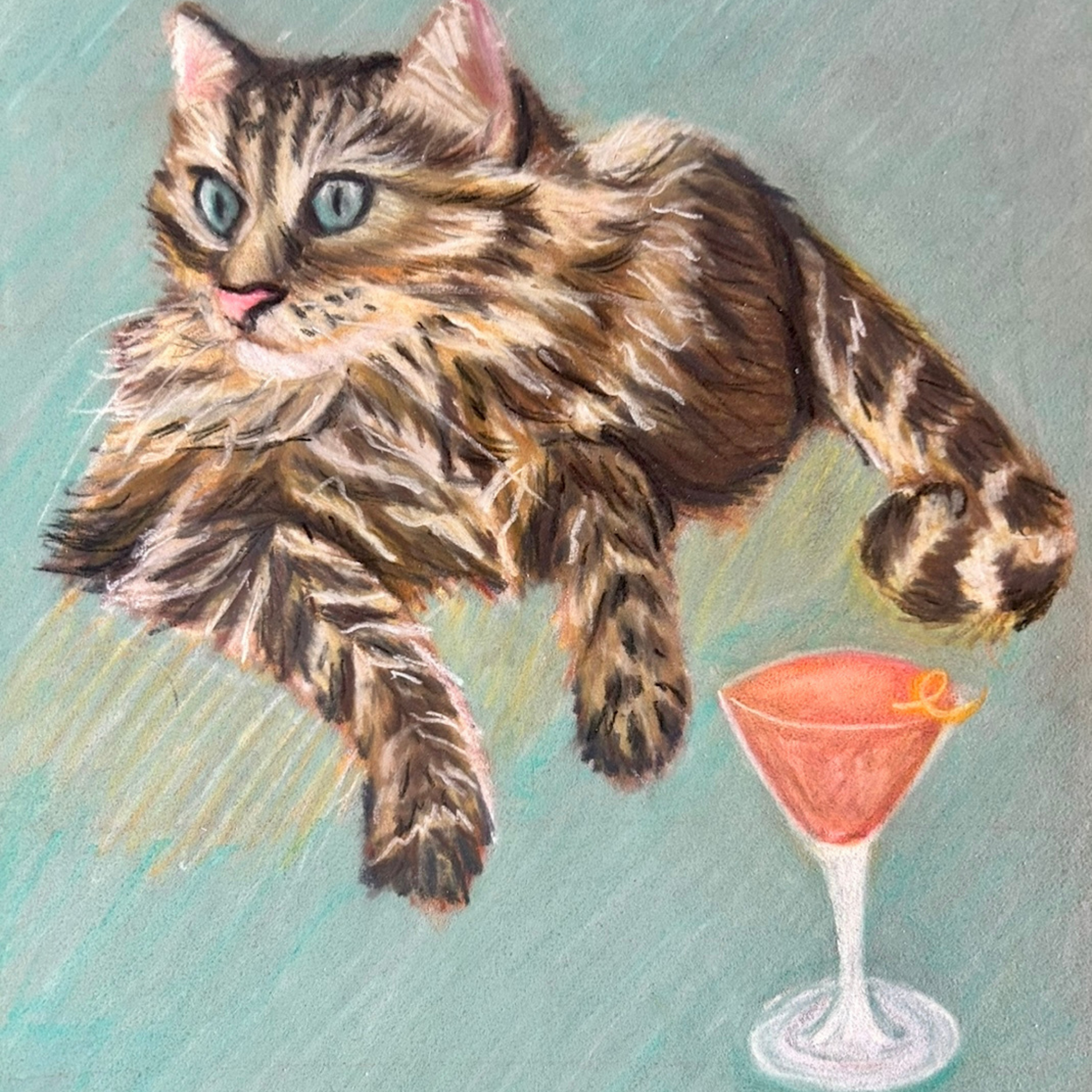 No need to wonder what drink your furry friend would choose, as we've captured the perfect match with a stylish tabby enjoying a refreshing and fun Cosmo. A unique and playful addition to any art collection.