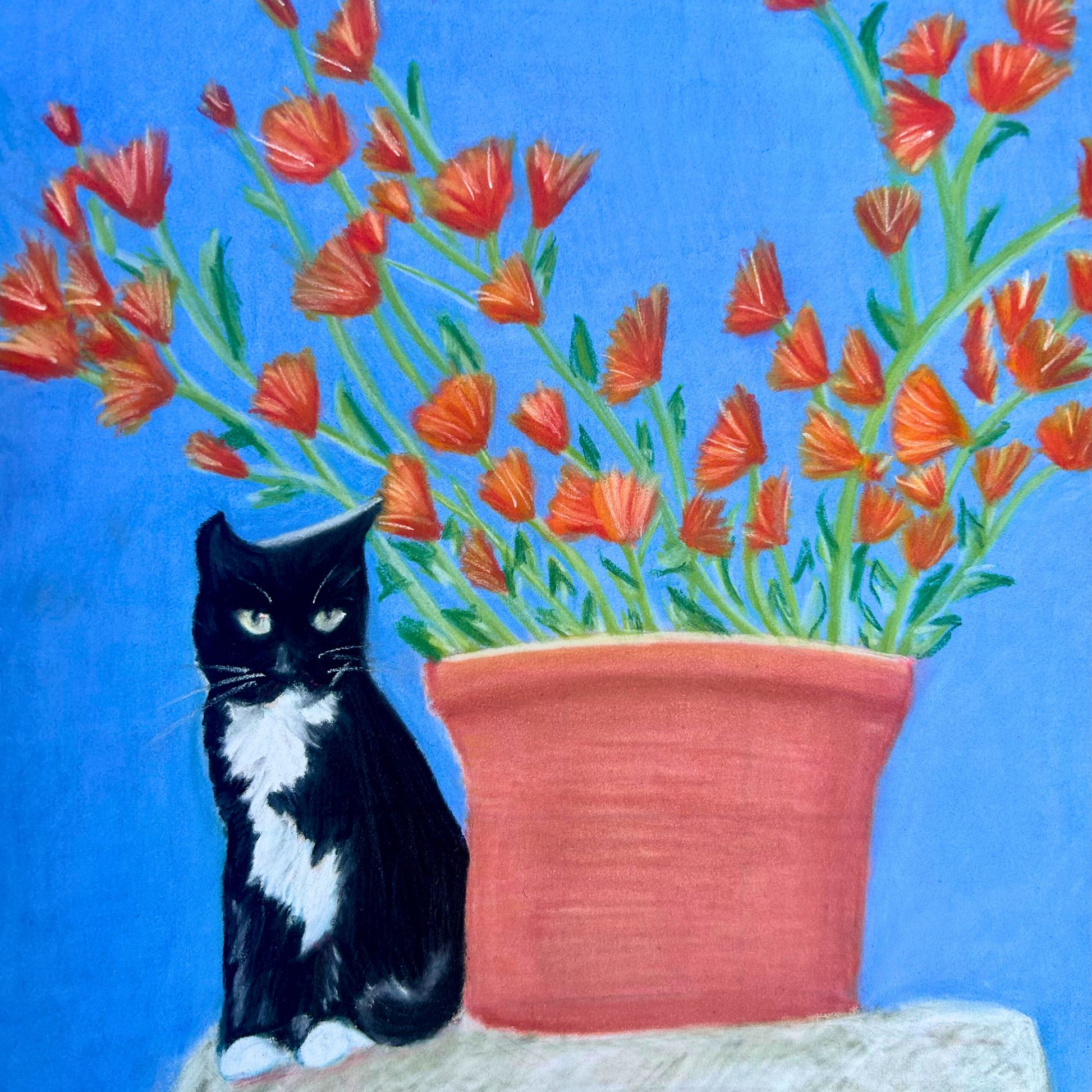 Rosie & The Flower Pot is a charming art print featuring a black and white tuxedo cat seated beside a vibrant red flower pot.