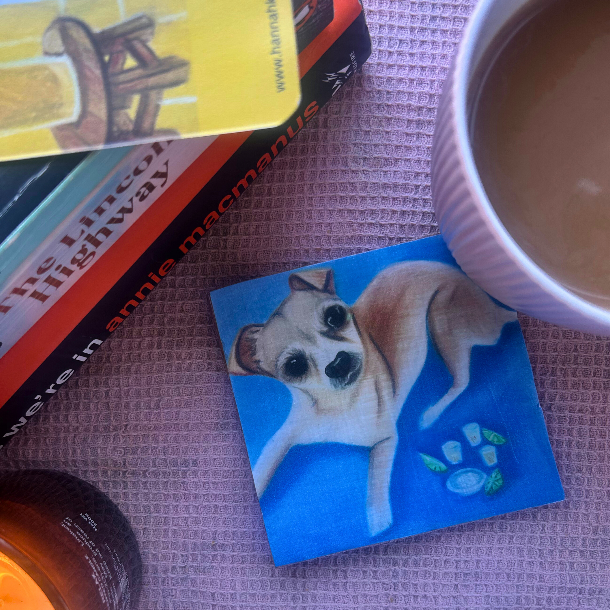 Add a splash of character to your coffee table with this illustrated coaster featuring a chihuahua with tequila chasers, designed by Glasgow-based artist Hannah Kelly.
